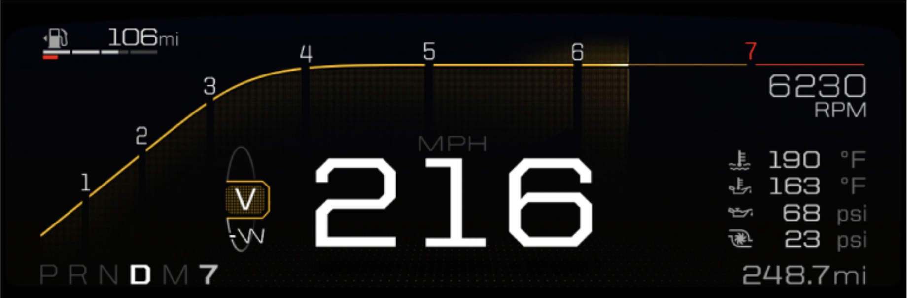 Coupled with the differentiating modes design and development worked heavily on proposing adaptive road and track performances through immersive visual feedback. ie: the faster you go, the larger the speedometer gets while everything de-emphasizes.